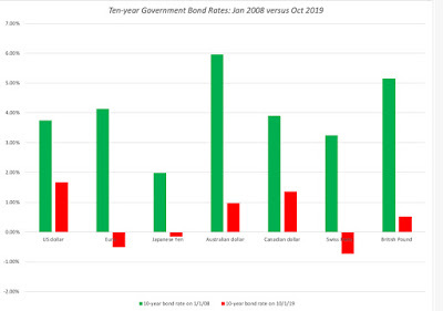 Bubble Argument 4: Central banks, around the world, have conspired to keep interest rates low and push up the price of financial assets (artificially) As you can see in the earlier graph comparing earnings to price rates to treasury bond rates, interest rates on government bonds have dropped to historic lows in the last decade. That is true not just in the US, but across developed markets, with 10-year Euro, Swiss franc and Japanese Yen bond rates crossing the zero threshold to become negative.