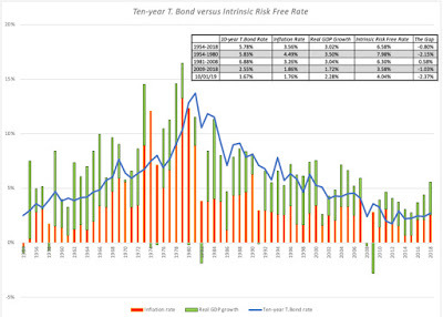 Download raw data on interest rates, inflation and growthLooking back over the last decade, it is low inflation and anemic economic growth that have been driving interest rates lower, not a central banking cabal. It is true that at the start of October 2019, the gap between the ten-year treasury bond rate and the intrinsic risk free rate is higher than it has been in a long time, suggesting that either Jerome Powell is a more powerful central banker than his predecessors or, more likely, that the bond market is building in expectations of lower inflation and growth.