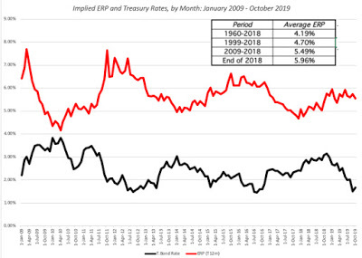 Download historical ERPThere are two uses for this number. First, it becomes the price of equity risk in my company valuations, allowing me to maintain market neutrality when valuing WeWork, Tesla or Kraft-Heinz. In fact, the valuations that I will do in October 2019 will use an equity risk premium of 5.55% (the implied premium on October 1, 2019, for the S&P 500) as my mature market premium. Second, though I have confessed to being a terrible market timer, the implied ERP has become my divining rod for overall market pricing. An unduly low number, like the 2% that I computed at the end of 1999 for the S&P 500, would represent market over-pricing and a really high number, such as the 6.5% that you saw at the start of 2009, would be a sign of market under-pricing. At 5.55%, I am at the high end of the range, not the low end, and that backs up the case that given treasury rates, earnings and cash flows today, stock prices are not unduly high.