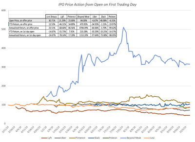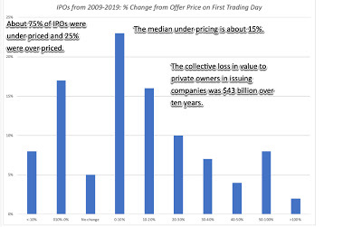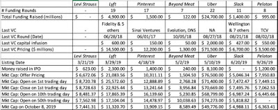 In almost every IPO this year, the basis for at least the initial estimate of what the company would get from the market was the pricing at the most recent VC round, about $66 billion for Uber, $47 billion for WeWorks on the Softbank investment and about $4.2 billion at Peloton. The strongest sales pitch that the company and its bankers seem to be making is that venture capitalists are smart people who know a great deal about the company, and that you should be willing to base your pricing on theirs. This is not very persuasive, because, as I noted in this post, VCs price companies, they don't value them, and the pricing ladder, while it can lead price up, up and away, can also bring price down, when the momentum shifts.