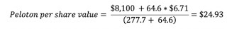Download spreadsheetMy equity value is $6.65 billion, but in computing value per share, I have to consider the overhang of past option issuances at the company; there are 64.6 million options, with an average strike price of $6.71, outstanding in addition to the 277.76 million shares that the company puts forward as its share count. Valuing the options and netting them out yields a value per share of $19.35, about 20% below the low end of the IPO offering. That does bring me closer to the initial offering price than I got with either my Uber or WeWork valuations, though that is damning Peloton with faint praise. The magnitude of options outstanding at Peloton make it an outlier, even among the IPO companies, and I would caution investors to take these options into account, when computing market capitalizations or per share numbers. For instance, this Wall Street Journal report this morning, after the offering price was set at $26-$29/share, used the actual share count of 277.76 million shares to extrapolate to a market capitalization of $8 billion, at the upper end of the pricing range. That is not true. In fact, if you pay $29/share, you are valuing the equity in this company at more $9.5-$10 billion, with the options counted in.