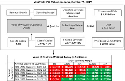 Valuing WeWorkAs I mentioned at the top of this post, I fundamentally mistrust the company, but I am not willing to dismiss its potential, without giving it a shot at delivering. In creating this narrative, I am buying into parts of the company’s own narrative and here are the components of my story:WeWork meets an unmet and large need for flexible office space: The demand comes both younger, smaller companies, still unsure about their future needs, and established companies, experimenting with new work arrangements. There is a big market, potentially close to the $900 billion that the company estimates.With a branded product & economies of scale: The WeWork Office is differentiated enough to allow them to have pricing power, and higher margins.And continued access to capital, allowing the company to both fund growth and potentially live through mild economic shocks. That access, though, will be insufficient to tide them through deeper recessions, where their debt load will leave them exposed to distress.This story translates into three key operating inputs:Revenue Growth: I will assume that revenues will grow at 60% a year, for the next five years, scaling down to stable growth (set equal to the riskfree rate of 1.6%) after year 10. If this seems conservative, given their triple digit growth in the most recent year, using this growth rate results in revenues of approximately $80 billion in 2029.Target Operating Margin: Over the next decade, I expect the company’s operating margins to improve to 12.50% by year 10. That is much higher than the average operating margin for real estate operating companies and higher than 11.04%, the average operating margin from 2014-2018 earned by IWG, the company considered to be closest to WeWork in terms of operating model. For those of you persuaded by the company’s argument that its locations make a 25% contribution margin, note that that measure of profitability is before corporate expenses, stock-based compensation and capital maintenance expenditures.Reinvestment Needs: The business will stay capital intensive, economies of scale notwithstanding, requiring significant investments in new properties and substantial ones in aging properties to preserve their earning power. I will assume that each dollar of additional capital invested into the business will generate $1.68 in additional revenues, again drawing on industry averages. (Currently, WeWork generates only 11 cents in revenues for every dollar invested, but in its defense, many of its locations are either just starting to fill or are not occupied yet.)From my perspective, this seems like an optimistic story, where WeWork generates pre-tax operating income of 10.07 billion on revenues of $80.5 billion in 2029, generating a 26.61% return on capital on intermediate capital investments. Allowing for a starting cost of capital of about 8%, the resulting value for the operating assets is about $29.5 billion, but before you decide to put all your money in WeWork, there are two barriers to overcome:Possibility of failure: The debt load that WeWork carries makes its susceptible to economic downturns and shocks in the real estate market, and the cost of capital, a going concern measure of risk, is incapable of capturing the risk of failure embedded in the business model. I will assume a 20% chance of failure in my valuation, and if it does occur, that the firm will have to sell its holdings for 60% of fair value.Debt load: As I noted in the last section, the company has accumulated a debt load, including lease commitments, of $23.8 billion. Adjusting for these, the resulting value of equity is $13.75 billion, and with my preliminary assessment of shares outstanding, translates into a value per share of about $26/share.