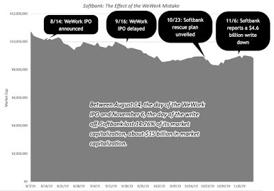Download spreadsheetSoon after my post, the ground shifted under WeWork, as a combination of arrogance (on the part of VCs, bankers and founders) and business model risks caught up with the company, and the IPO was delayed, albeit reluctantly by the company. That action, though, left the company in a cash crunch, since it had been counting on the IPO to bring in $3 billion in capital to cover its near-term needs. In conjunction with a loss of trust in the top management of the company, created a vicious cycle with the very real possibility that the company would implode. As WeWork sought rescue packages, Softbank offered a lifeline, with three components to it:Equity Buyout: A tender offer of $3 billion in equity to buy out of existing stockholders in the firm to increase its share of the equity ownership to 80%. In an odd twist, Softbank contended that, after the financing, “it will not hold a majority of the voting rights… and does not control the company… WeWork will not be a subsidiary of Softbank. WeWork will be an associate of Softbank”. I am not sure whether this is a true confession of lack of control or a ploy to keep from consolidating WeWork (and its debt load) into Softbank's financials.Added Capital: Softbank would provide fresh debt financing of $5 billion ($1.1 billion in secured notes, $2.2 billion in unsecured notes and $1.75 billion as a line of credit) and an acceleration of a $1.5 billion equity investment it had been planning to make into WeWork in 2020, giving WeWork respite, at least in the short term, from its cash constraints.Neutering Adam Neumann (at a cost): The offer also includes a severing of Adam Neumann’s leadership of the company, in return for which he will receive $1 billion in cash, $500 million as a loan to repay a JP Morgan credit line and $185 million for a four-year position as a consultant. I assume that the consulting fee is more akin to a restraining order, preventing him from coming within sighting distance of any WeWork office or building.Since that deal was put together, the storyline has shifted, with Softbank now playing the lead role in this morality play, with multiple questions emerging:What motivated Softbank to invest so much more in a company where it had already lost billions? Some are arguing that Softbank had no choice, given the magnitude of what they had invested in WeWork, and others are countering that they were throwing good money after bad. With mark-to-market rules in effect at Softbank, how will accountants reflect the WeWork disaster on Softbank’s books? I think that fair-value accounting is neither fair nor is it about value, but the WeWork write down that Softbank had to take is a good time to discuss how fair-value accounting can have a feedback effect on corporate decision making.Is Masa Son a visionary genius or an egomaniac in need of checks and balances? A year ago, there were many who viewed Masa Son, with his 300-year plans and access to hundreds of billions of dollars in capital, was a man ahead of his time, epitomizing smart money. Today, the consensus view seems to be that he is an impulsive and emotional investor, not to be trusted in his investment judgments. The truth, as is often the case, lies somewhere in the middle.Since Softbank is a holding company, deriving a chunk of its value from its perceived ability to find start-ups and young companies and convert them into big wins, how will its value change as a result of its WeWork missteps? To answer this question, I will look at how Softbank’s market capitalization has changed over time, especially around the WeWork fiasco, and examine the consequences for its Vision fund plans.