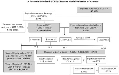 Before we price and value Aramco, there are a few twists to this IPO that should be clarified, since they may affect how much you are willing to pay. The prospectus, filed on November 10, sheds some light:Dividends: In the ending on September 30, 2019, Aramco paid out an ordinary dividend of $13.4 billion, entirely to the Saudi Government, and it plans to pay an additional interim dividend of at least $9.5 billion to the government, prior to the offering. The company commits to paying at least $75 billion in dividends in 2020, with holders of shares issued in the IPO getting their share, and to maintaining these dividends through 2024. Beyond 2024, dividends will revert back to their normal discretionary status, with the board of directors determining the appropriate amount. As an aside, the dividends to non-government shareholders will be paid in Saudi Riyal and to the government in US dollars.IPO Proceeds: The prospectus does not specify how many shares will be offered in the initial offering, but it is not expected to be more than a couple of percent of the company. None of the proceeds from the IPO will remain in Aramco. The government will redirect the proceeds elsewhere, in pursuit of its policy of making Saudi Arabia into an economy less dependent on oil.Trading constraints: Once the offering is complete, the shares will be listed on the Saudi stock exchange and its size will make it the dominant listing overnight, while also subjecting it to the trading restrictions of the exchange, including a limit of a 10% movement in the stock price in a day; trading will be stopped if it hits this limit.Inducements for Saudi domestic investors: In an attempt to get more domestic investors to hold the stock, the Saudi government will give one bonus share, for every ten shares bought and held for six months, by a Saudi investor, with a cap at a hundred bonus shares.Royalties & Taxes: In my view, it is this detail that has been responsible for the delay in the IPO process and it is easy to see why. For all of its life, Aramco has been the cash machine that keeps Saudi Arabia running, and the cash flows extracted from the company, whether they were titled royalties, taxes or dividends, were driven by Saudi budget considerations, rather than corporate interests. Investors were wary of buying into a company, where the tax rate and the royalties were fuzzy or unspecified and the prospectus lays out the following. First, the corporate tax rate will be 20% on downstream taxable income, though tax rates on different income streams can be different. The Saudi government also imposes a Zakat, a levy of 2.5% on assessed income, thus augmenting the tax rate. In sum, these tax rate changes were already in effect in 2018, and the company paid almost 48% of its taxable income in taxes that year. Second, the royalties on oil were reset ahead of the IPO and will vary, depending on the oil price, starting at 40% if oil prices are less than $70/barrel, increasing to 45% if they fell between $70 and $100, and becoming 80% if the oil price exceeds $100/barrel. A Pricing of Aramco