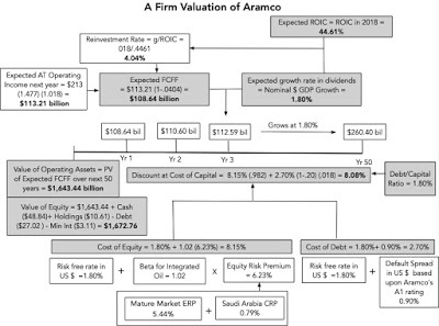 Over the weekend, we got a little more clarity on the IPO details, with a rumored pricing of $1.7 trillion for the company's equity and a planned offering of 1.5% of the outstanding shares. That price is within shouting distance of my valuation, and my guess is that given the small size of the offering (at least on a percentage basis), it will attract enough investors to be fully subscribed. At this pricing, I think that the company will be more attractive to domestic than international investors, with Saudi investors, in particular, induced to invest by the company's standing in the country. It will be a solid investment, as long as investors recognize what they are getting is more bond than stock, with dividends representing the primary return and limited price appreciation. They will have no say in how the company is run, and if they don't like the way it is run, they will have to vote with their feet. If they are worried about risk, the research they should do is more political than economic, with the primary concerns about regime stability. The one concern that you should have, if you are a Saudi investor, with your human capital and real estate already tied to Saudi Arabia's (and oil's) well being, investing your wealth in Aramco will be doubling down on that dependence.