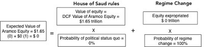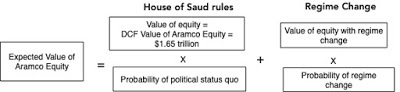 Consider the most extreme case. If you believe that regime change in imminent and certain, and that the change will be extreme (with equity being expropriated and Aramco being brought back entirely into the hands of the state), my expected value for equity becomes zero: