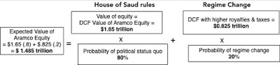 That, in an entirely subjective nutshell, is why I think Aramco's equity value is closer to $1.5 trillion than $1.7 trillion. As with all my other valuations, I understand that your judgments on Aramco will be different from mine, but I think that the disagreements we have are not so much on the going concern estimates of cash flows and risk but on the likelihood and consequences of regime change.