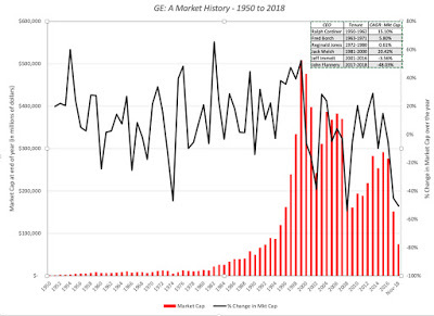 It seems like ancient history, but it was just 2001, when GE was the most valuable company in the world, commanding a market capitalization in excess of $500 billion. The quintessential conglomerate, with a presence in almost every part of the global economy, it seemed to have been built to withstand economic shocks and was the choice for conservative investors, scared of the short life cycles and the volatile fortunes of its tech challengers. Unlike other aging companies like Sears that have decayed gradually over decades, GE's fall from grace has been precipitous , with the rate of decline accelerating the in the last two years. As a new CEO is brought in, with hopes that he will be a savior, it is the right time to both look back and look forward at one of the globe's most iconic companies.