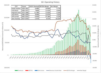 As you can see, GE was a solid but unspectacular investment from 1950 to 1980, and exploded in value in the 1980s and 1990s, with Jack Welch at its helm, and reached its most valuable company in the world status in 2001. Under Jeff Immelt, his successor, the stock continued to do well, but it dropped with the rest of the market as the dot com bubble burst, but then recovered leaving into the 2008 crisis. That crisis was devastating for the company and while it did recover somewhat in the years after, the bottom has clearly dropped out in the last two years, with Jeff Flannery at the top of the company.