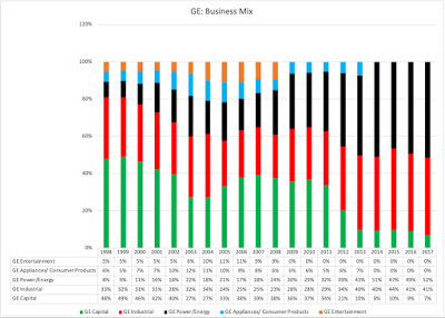 The Business Mix ShiftTo understand GE's current plight, we have to go back to Welch's tenure as CEO, when he remade the firm, by moving it away from its domestic and manufacturing roots and giving it a global and multi-business focus. GE's biggest leap during that period was into the financial services business, and one reason Welch was attracted to the financial services business was its capacity to generate high profits with relatively little investment. By the late 1990s, GE Capital was the engine driving GE's growth, accounting for almost 48% of revenues in 1998 and as you can see in the graph below, it continued to do so for much of the first decade of Immelt's stewardship: