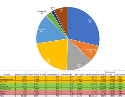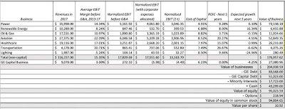 GE Annual Report for 2017 (Invested Capital, allocated based upon assets by business)Today, GE is in three businesses (aviation, healthcare and transportation) that have low growth and high profitability (margins and returns on capital), in three energy-related businesses (power, renewable energy and oil) with higher growth but low profitability (margins & returns on capital), one business (lighting) that is fading quickly and one (capital) that is declining, but dragging value down with it. Note also that the collective profits reported across businesses is before corporate expenses and eliminations of $3.83 billion (not counting a one-time restructuring charge of $4.1 billion) that effectively wipe out about half of the operating profits. When computing return on capital, I allocated these expenses to the businesses, based upon revenues, and used a 25% effective tax rate, and while GE as a whole did not deliver a return that meets its cost of capital requirements in 2017, aviation, healthcare and transportation clear their hurdle rates by plenty. Replacing 2017 income in each business with a normalized value (computed using the average margins in each business between 2013 and 2017) improves the return on capital at the power and renewable energy businesses, but the overall conclusion remains the same. GE, as a company, does not look good, but it does have significant value creating businesses.