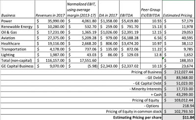 GE's light bulb moment might have been in Thomas Edison's lab in 1878, but at an official corporate age of 126 years, GE is an ancient company and its problems reflect its age. Other than renewable energy, all of GE's businesses are mature or declining, and by the laws of mathematics, GE itself is a mature to declining company. Any story that you tell about GE going forward has to reflect this reality, and there are three possible ones that can lead to different values.1. Break it up: If GE at its peak represented the glory of conglomerates, its current plight is a sign of how far conglomerates have fallen in the world. Across the world, multi business companies are finding themselves under pressure to break up and in many cases, their stockholders will be better off if they do. To gain from a break up, though, here are some of the things that have to be true. Separable businesses: The different businesses have to be separable, since leakages and synergies across businesses can make it more difficult to cleave off pieces to sell or spin off. On this count, GE is probably on safe ground, since its businesses (other than GE Capital) are self standing, for the most part, with little in terms of cross business effects. Willing buyers: There have to be potential buyers who are willing to pay prices for the pieces that exceed what they will generate as value for the holding company, as going concerns, and those higher prices either have to come from potential synergies or changed management. None of GE's businesses seem alluring enough to attract multiple bidders, willing to pay premium prices, and given GE's shaky bargaining position, it is more likely than not that a rush to unload businesses will do more harm than good. Corporate Waste (at HQ): A large chunk of the corporate overhead has to viewed as wasteful, with a big drop in corporate expenses accompanying the breakup. How much of the corporate expense of $3.8 billion that GE reported in 2017 is wasteful and could be eliminated with targeted cost cuts? Looking at the breakdown of these expenses, just about $2.2 billion in for covering pension obligations and breaking up the company will not relieve the company of its contractual obligations. Some of the remaining $1.6 billion may be fat that can be cut, but even cutting the entire amount (which would be a tall order) will not turn the company around.Since GE will be trying to sell these businesses to buyers today, this is a pricing and not a valuation exercise, and I have estimate a pricing for GE's businesses below, using an EBITDA recomputed using the average operating margin in each business over the last five years to compute operating income and allocating corporate expenses to the divisions, based upon revenues. To convert the EBITDA to an estimated value, I used the EV/EBITDA multiples of the peer group:
