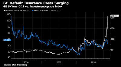 Download spreadsheetThe value that I derive for equity is lower than the $103 billion that I estimated in the last section, but it does not require any near term fire sales at discounts. There are two big challenges that GE will face along the way. The first is that GE is saddled with a significant debt obligation, a legacy of GE Capital, that will not fade away quickly, and the debt obligations represent a clear and present danger to the firm. One reason for the rapid drop in GE's stock price in the last few weeks has been the deterioration in the company's credit standing, as can be seen in the rising default spreads for the company in the CDS market.