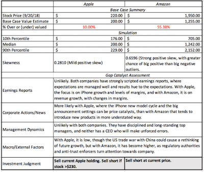 My September Valuations: A Look BackIn September, I valued Apple and Amazon and arrived at a value per share of roughly $200 for Apple and $1255 for Amazon, well below their prevailing stock prices of $220 (Apple) and $1950 (Amazon). I was also open about the fact that my valuations reflected my stories for the companies, and that my assumptions were open for debate. In fact, I estimated value distributions for both companies and noted that not only did I face more uncertainty in my Amazon valuation, but also that there was a significant probability in both companies that my assessment (that the stocks were over valued) was wrong. I summarized my results in a table that I reproduce below: