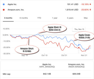 My Apple short sale which was initiated on October 3 was closed out on November 5 at $205, while Amazon got tantalizingly close to my trigger price for covering of $1412 (with a low of $1420 on November 20), before rebounding.