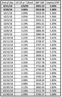 During October, for instance, the equity risk premium moved from 5.38% at the start of the month to 5.76% by the end of the month, with wide swings during the course of the month.