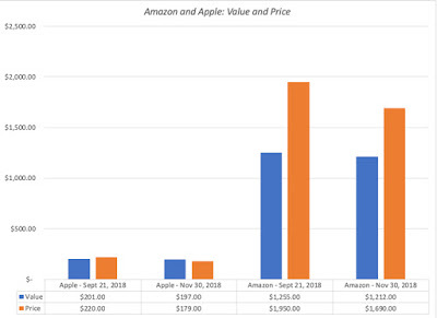Plugging in the higher equity risk premium and the slightly lower risk free rate into my Apple valuation, leaving the rest of my inputs unchanged, yields a value of $197 for the company, about 1.5% less than my $200 estimate on September 21. With Amazon, the effect is slightly larger, with the value per share dropping from $1255 per share to $1212, about 3.5%. Those changes may seem trivial but if the market correction had been larger and the treasury rate had changed more, the value effect would have been larger.But price changes even more: If the fact that value changes over time, even in the absence of company-specific information, makes you uncomfortable, keep in mind that the market price usually changes even more. In the case of Apple and Amazon, this is illustrated in the graph below, where I compare value to price on September 21 and November 30 for both companies: