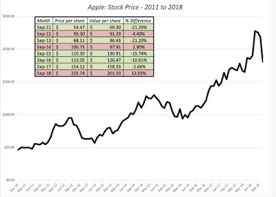 In just over two months, Apple's value has declined from $201 to $196, but the stock price has dropped from $220 to $179, shifting it from being overvalued by 9.54% to undervalued by 9.14%. Amazon has become less over valued over time, with the percentage over valuation dropping from 55.38% to 39.44%. I have watched Apple's value dance with its price for much of this decade and the graph below provides the highlights: