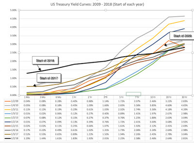 Yield Curves over timeThe yield curve is a simple device, plotting yields across bonds with different maturities for a given issuing entity. US treasuries, historically viewed as close to default free, provide the cleanest measure of the yield curve, and the graph below compares the US treasury yield curve at the start of every year from 2009 to 2018, i.e., the post-crisis years: