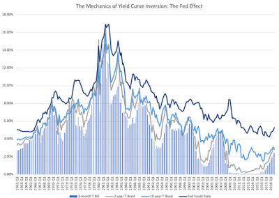 Interest Rate = Expected Inflation Rate + Expected Real Interest RateOver much of the last century, the US treasury yield curve has been upward sloping, and the standard economic rationalization for it is a simple one. In a market where expectations of inflation are similar for the short term and the long term, investors will demand a "maturity premium" (or a higher real interest rate) for buying longer term bonds, thus causing the upward tilt in the yield curve. That said, there have been periods where the yield curve slopes downwards, and to understand why this may have a link with future economic growth, let's focus on the mechanics of yield curve inversions. Almost every single yield curve inversion historically, in the US, has come from the short end of the curve rising significantly, not a big drop in long term rates. Digging deeper, in almost every single instance of this occurring, short term rates have risen because central banks have hit the brakes on money, either in response to higher inflation or an overheated economy. You can see this in the chart below, where the Fed Funds rate (the Fed's primary mechanism for signaling tight or loose money) is graphed with the 3 month, 2 year and 10 year rates: