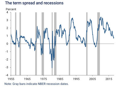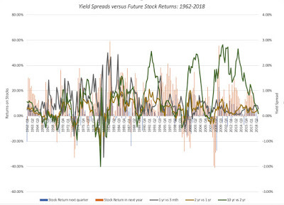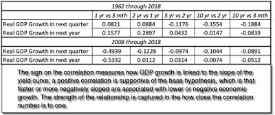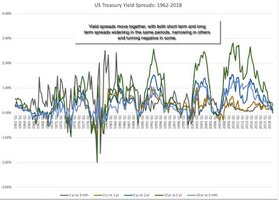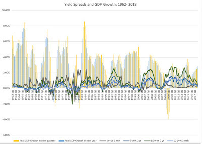 Taking a closer look at the data, here is what I see;It is the short end that has predictive power for the economy: Over the entire time period (1962-2018), the slope of the short end of the yield curve is positively related with economic growth, with more upward sloping yield curves connected to higher economic growth in subsequent time periods. The slope at the long end of the yield curve, including the widely used differential between the 10-year and 2-year rate not only is close to uncorrelated with economic growth (the correlation is very mildly negative).Even that predictive power is muted: Over the entire time period, even for the most strongly linked metric (which is the 2 year versus 1 year), the correlation is only 29%, for GDP growth over the next year, suggesting that there is significant noise in the prediction. And 2008 may have been a structural break: Looking only at the last ten years, the relationship seems to have reversed sign, with flatter yield curves, even at the short end, associated with higher real growth. This may be a hangover from the slow economic growth in the years after the crisis, but it does raise red flags about using this indicator today.How do you reconcile these findings with both the conventional wisdom that inverted yield curves are negative indicators of future growth and the empirical evidence that almost every inversion is followed by a recession? It is possible that it is the moment of inversion that is significant, perhaps as a sign of the Fed's conviction, and that while the slope of the yield curve itself may not be predictive, that moment that the yield curve inverts remains a strong indicator.