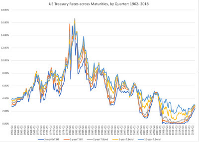 To begin this assessment, I looked at the rates on three-month and one-year T.Bills and the two, five and ten-year treasury bonds at the end of every quarter from 1962 through the third quarter of 2018: