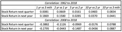 Interest Rate Raw DataIf you see a pattern here, you are a much better chart reader than I am. I therefore followed up the analysis by replicating the correlation table that I reported in the economic growth section, but looking at stock returns in subsequent periods, rather than real GDP growth: