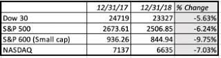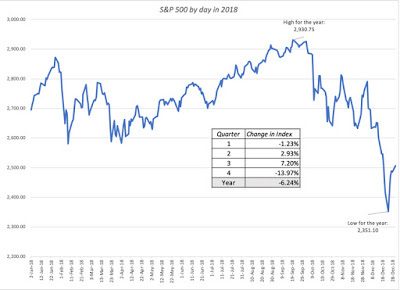 The market shook off its tech blues by the end of March and continued to rise through the summer, with the S&P 500 peaking for the year at 2931 on September 20, 2018. For the many investors who were already counting their winnings for the year, the last quarter of 2018 was a shock, as volatility returned to the market with a vengeance. In October, the S&P 500 dropped by 6.94%, though it felt far worse because of the day-to-day and intraday price swings. In November, the S&P 500 was flat, but volatility continued unabated. In December, US equities finally succumbed to selling pressures, as a sharp selloff pushed stocks close to the "bear market" threshold, before recovering a little towards the end of the year.