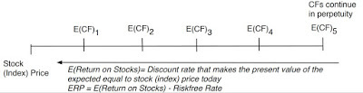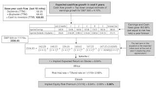 The Equity Risk PremiumIf you have been a reader of this blog, you know that my favorite device for disentangling the mysteries of the market is the implied equity risk premium, an estimate of the price that investors are demanding for the risk of investing in equities. I back this number out from the current market prices and expected future cash flows, an IRR for equities that is analogous to the yield to maturity on a bond: