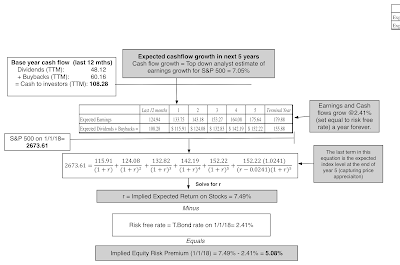 At the start of 2018, I estimated the equity risk premium, using the index at that point in time (2673.61), the 10-year treasury bond rate on that day (2.41%) and the growth rate that analysts were projecting for earnings for the index (7.09%).