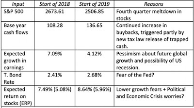 Higher interest rates: The fear of the Fed has roiled markets for much of the last decade, and while it has played out as higher short term interest rates for the last two years, the ten-year bond rate, after a surge over 3% in 2018, is now back to 2.68%. There is the possibility that higher inflation and economic growth rate can push this number higher, but it is difficult to see how this would happen if recession fears pan out. In fact, as I noted in this post from earlier in the year, higher interest rates, if the trigger is higher real growth (and not higher inflation), could be a positive for stocks, not a negative.Pullback on cash flows: US companies have been returning huge amounts of cash in the form of stock buybacks and dividends. In 2018, for instance, dividends and buybacks amounted to 92% of aggregate earnings, higher than the 84.60% paid out, on average, between 2009 and 2018, but still lower than the numbers in excess of 100% posted in 2015 and 2016. Assuming that the payout will adjust over time to 85.07%, reflecting expected long term growth, lowers the ERP to 5.55%, still well above historical levels.Political and Economic Crises: The trade war and the Brexit mess will play out this year and each has the potential to scare markets enough to justify the higher ERP that we are observing. In addition, it goes without saying that there will be at least a crisis or two that are not on the radar right now that will hit markets, an unwanted side effect of globalization.