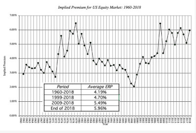 What now?I know that you are looking for a bottom line here on whether the numbers are aligned for a good or a bad year for stocks, and I will disappoint you up front by admitting that I am a terrible market timer. As an intrinsic value investor, the only market-related question that I ask is whether I find the current price of risk (the implied ERP) to be an acceptable one; if it is too low for my tastes, I would shift away from stocks, and if it is too high, shift more into them. To gain perspective, I graphed the implied ERP from 1960 through 2018 below: