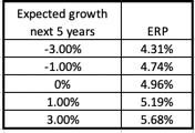 Recession and lower growth: While there was almost no talk about a possible recession either globally or in the US, at the start of 2018, some analysts, albeit a minority, are raising the possibility that the economy would slow down enough to push it into recession, at the start of 2019. While the lower earnings growth used in the 2019 computation already incorporates some of this worry, a recession would make even the lower number optimistic. In the table below, I have estimated the effect on the equity risk premium of lower growth, and note that even with a compounded growth rate of -3% a year for the next five years, the ERP stays above the historical average of 4.19%.