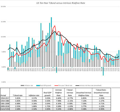 What does all of this mean for investors today? I think that we may be making two mistakes. One is to take a blip on a day (the inversion in the 2 and 5 year bonds on December 4) and read too much into it, as we are apt to do when we are confused or scared. It is true that a portion of the yield curve inverted, but if history is any guide, its predictive power for the economy is weak and for the market, even weaker. The other is that we are taking rules of thumb developed in the US in the last century and assuming that they still work in a vastly different economic environment.