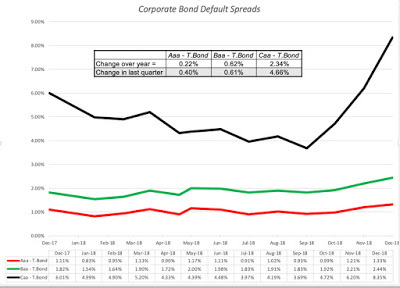 Bottom LineFor the most part, the bond and stock markets were singing from the same song book this year. Both markets started the year, expecting continued strength in the economy, but both became less upbeat about economic prospects towards the end of the year. For stock markets, this translated into expectations of lower earnings growth and stock prices, and for bond markets, its showed up as lower treasury bond rates and higher default spreads. Investors in both markets became more wary about risk and demanded higher prices for taking risk, with higher equity risk premiums in the stock market and higher default spreads in the bond market.