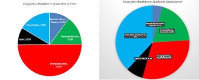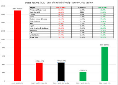 I am aware of the limitations of this comparison. First, I am using the trailing twelve month operating income as profits, and it is possible that some of the firms that measure up well and badly just had a really good (bad) year. It is also biased against young and growing firms, where future income will be much higher than the trailing 12-month value. Second, operating income is an accounting measure, and are affected not just by accounting choices, but are also affected by the accounting mis-categorization of lease and R&D expenses. Third, using book value of capital as a proxy for invested capital can be undercut by not only whether accounting capitalizes expenses correctly but also by well motivated attempts by accountants to write off past mistakes (which create charges that lower invested capital and make return on capital look better than it should). In fact, the litany of corrections that have to be made to return on capital to make it usable and listed in this long and very boring paper of mine. Notwithstanding these critiques, the numbers in this graph tell a depressing story, and one that investors should keep in mind, before they fall for the siren song of growth and still more growth that so many corporate management teams sing. Globally, approximately 60% of all firms globally earn less than their cost of capital, about 12% earn roughly their cost of capital and only 28% earn more than their cost of capital. There is no region of the world that is immune from this problem, with value destroyers outnumbering value creators in every region.