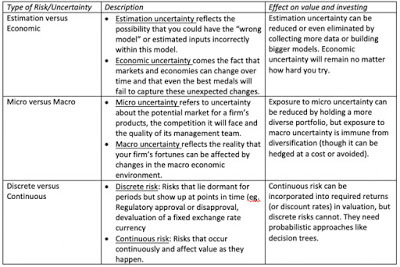 Note that some of these risks are more difficult to estimate and deal with than others, but that does not mean that you can avoid them or not deal with them. In fact, as I have argued repeatedly, your best investment opportunities may be where it is darkest.