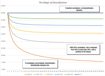 Download diversification benefits spreadsheetIf the assets are uncorrelated, the standard deviation of the portfolio drops to just above 5%, but note that the benefits persist as long as the assets in your portfolio are not perfectly positively correlated, which is good news since stocks are usually positively correlated with each other. Furthermore, the greatest savings occur with the first few stocks that are added on, with about 80% of the benefits accruing by the time you get to a dozen stocks, if they are not all in the same sector or share the same characteristics (in which case the correlation across those stocks will be higher, and the benefit lower).