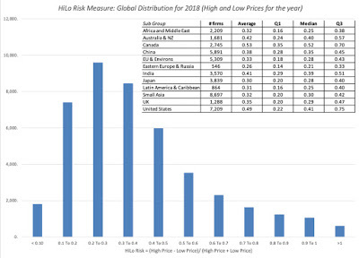 Data at country level As with the HiLo risk measure, and for the same reasons, the US, Canada and Australia look riskier than most emerging markets. Again, I report on the regional differences in the table embedded in the graph, with country-level statistics available at this link.