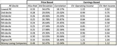 The high/low risk measure is simple to compute and requires minimal data, since all you need is the high price and the low price for the year. It is even intuitive, especially if you track market prices continuously. It does come with two problems. The first is the flip side of its minimal data usage, insofar as it throws away all data other than the high and the low price. The second is a more general problem with any price based risk measure, which is that for the price to move, there has to be trading, and markets that are liquid will therefore see more price movements, especially over shorter time period, than markets that are not. It is therefore not surprising that US stocks look riskier than African stocks, simply because liquidity is greater in the US. So, why bother? If you are comparing stocks within the same liquidity bucket, say the S&P 500, the high-low risk measure may correlate well with the true risk of the company. However, if your comparisons require you to look across stocks with different liquidity, and especially so if some are traded in small, emerging markets, you should use this or any other price-based measure with caution.