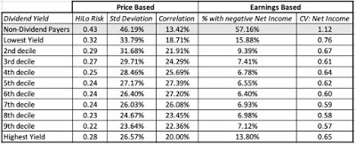 As with the HiLo risk measure, computing a standard deviation in stock prices, without adjusting for price levels, would yield the unsurprising conclusion that higher prices stocks have higher standard deviations. With this measure, the scaling adjustment becomes a simpler one, since using percentage price changes, instead of prices themselves, should level the playing field. In fact, if you wanted a fully integrated measure of returns, you should also include dividends in the periods where you receive them. However, since dividends get paid, at most, once every quarter, analysts who use daily or weekly returns often ignore them.