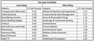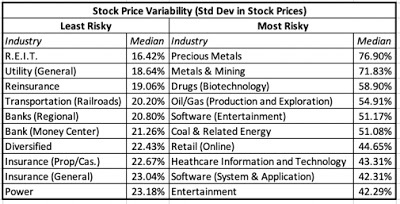 In my last post, where I updated risk measures across the world, I also looked at how these measures varied across different industries/businesses. In particular, I highlighted the ten most risky and safest industries, based upon both price variability and earnings variability, and noted the overlap between the two measures. I also looked at how the perceived risk in a business can change, depending upon investor diversification, and captured this effect with the correlation with the overall market. If you are diversified, I argued that you would measure the risk in an investment with the covariance of that investment with the market, or in its standardized form, its beta.