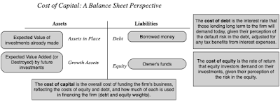 The simplest way to introduce hurdle rates is to look at them from the perspectives of the capital providers to a business. Using a financial balance sheet as my construct, here is a big picture view of these costs:
