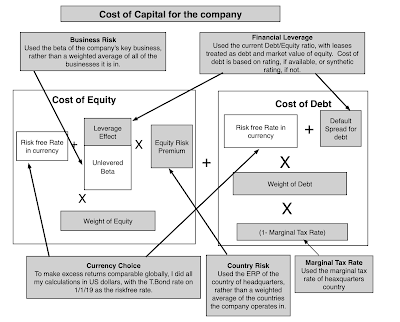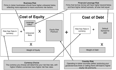 II. Financial LeverageYou can run a company, without ever using debt financing, or you can choose to borrow money to finance operations. In some cases, your lack of access to new equity may force you to borrow money and, in others, you may borrow money because you believe it will lower your cost of capital. In general, the choice of whether you use debt or equity remains one of the key parts of corporate finance, and I will discuss it in one of my upcoming data posts. In this post, though, I will just posit that your cost of capital can be affected by how much you borrow, unless you live in a world where there are no taxes, default risk or agency problems, in which case your cost of capital will remain unchanged as your funding mix changes. If you do borrow money to fund some or a significant portion of your operations, there are three numbers that you need to estimate for your cost of capital: