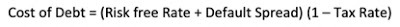 Cost of Debt: The cost of debt, which is set by lenders based upon how much default risk that they see in a company, will enter the cost of capital equation, with an added twist. To the extent that the tax law is tilted towards debt, the after-tax cost of borrowing will reflect that tax benefit. Since this cost of debt is a cost of borrowing money, long term and today, you cannot use a book interest rate or the interest rate on existing debt. Instead, you have to estimate a default spread for the company, based upon either its bond ratings or financial ratios, and add that spread on to the risk free rate:
