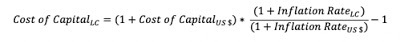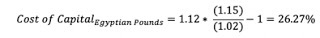 To illustrate, assume that you have a US dollar cost of capital of 12% for an Egyptian company and that the inflation rates are 15% and 2% in Egyptian Pounds and US dollars respectively: