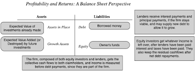 Profit MeasuresBefore I present multiple measures of profitability, it is useful to step back and think about how profits should be measured. I will use the financial balance sheet construct that I used in my last post to explain how you can choose the measure of profitability that is right for your analysis: