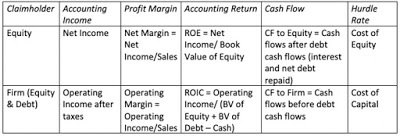 Just as hurdle rates can vary, depending on whether you take the perspective of equity investors (cost of equity) or the entire business (cost of capital), the profit measures that you use will also be different, depending on perspective. If looked at through the eyes of equity investors, profits should be measured after all other claim holders (like debt) and have been paid their dues (interest expenses), whereas using the perspective of the entire firm, profits should be estimated prior to debt payments. In the table below, I have highlighted the various measures of profits and cash flows, depending on claim holder perspective: