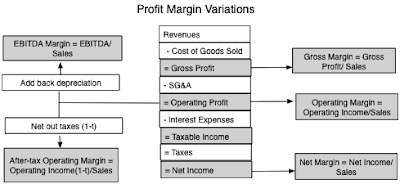 The Relative Test: Scaled ProfitabilityOnce a company starts making money, it is obvious that higher profits are better than lower ones, but unless these profits are scaled to the size of the firm, comparing dollar profits will bias you towards larger firms. The simplest scaling measure is revenues, a data item available for all but financial service firms, and one that is least likely to be affected by accounting choices, and profits scaled to revenues yields profit margins. In a data update post from a year ago, I provided a picture of different margin measures and why they might provide different information about business profitability: