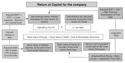 Since it is impossible to do this for 42000 plus companies, on a company-by-company basis, I used blunt instrument measures of each component, measuring profits with last year's operating income after taxes, using book value of capital (book value of debt + book value of equity - cash) as invested capital: